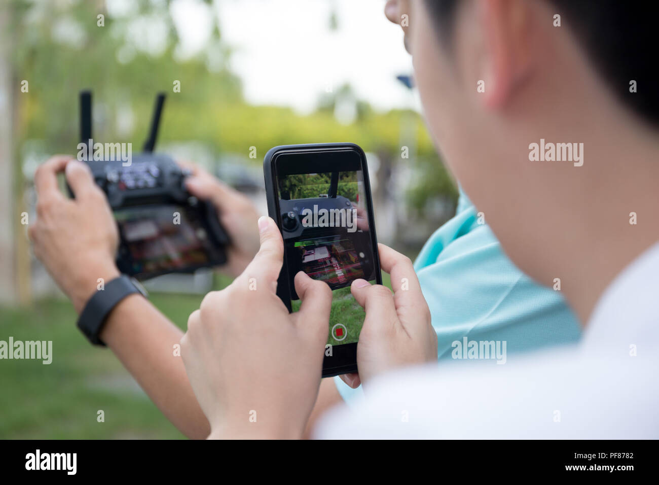 Hand Handy Video Bei Radio Control Drone In Blur Hintergrund