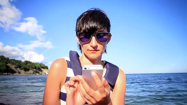 Junge Frau Mit Handy Auf Meer Hintergrund