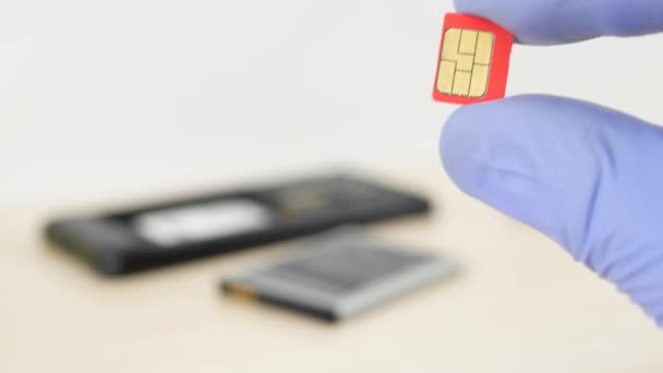 Hand Die Roten Micro Sim Karte Auf Zerlegten Handy Hintergrund