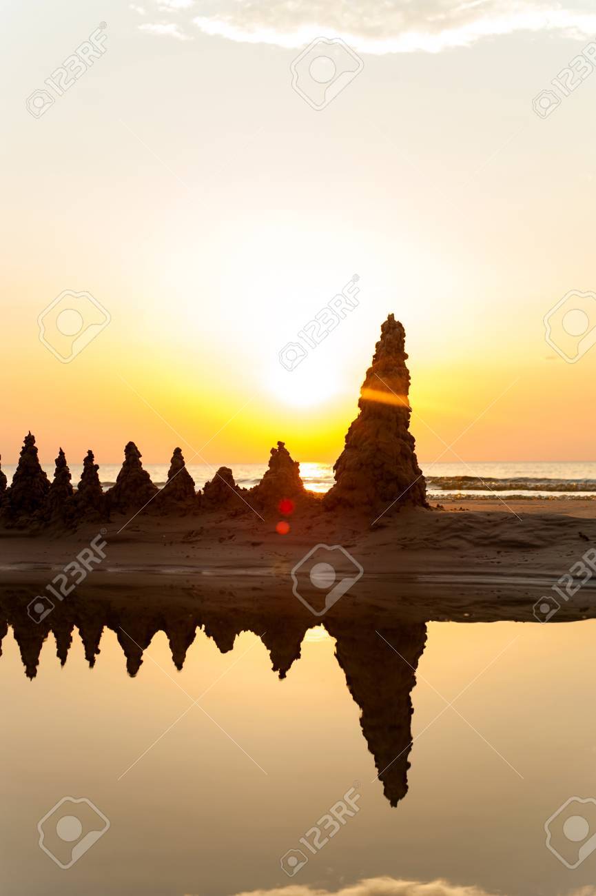 Strand Mit Sandburgen Am Spektakulären Ostsee Sonnenuntergang Hintergrund In Lettland Bunte Sommerzeit Im Freien Vertikale Bild Kopieren Sie Raum