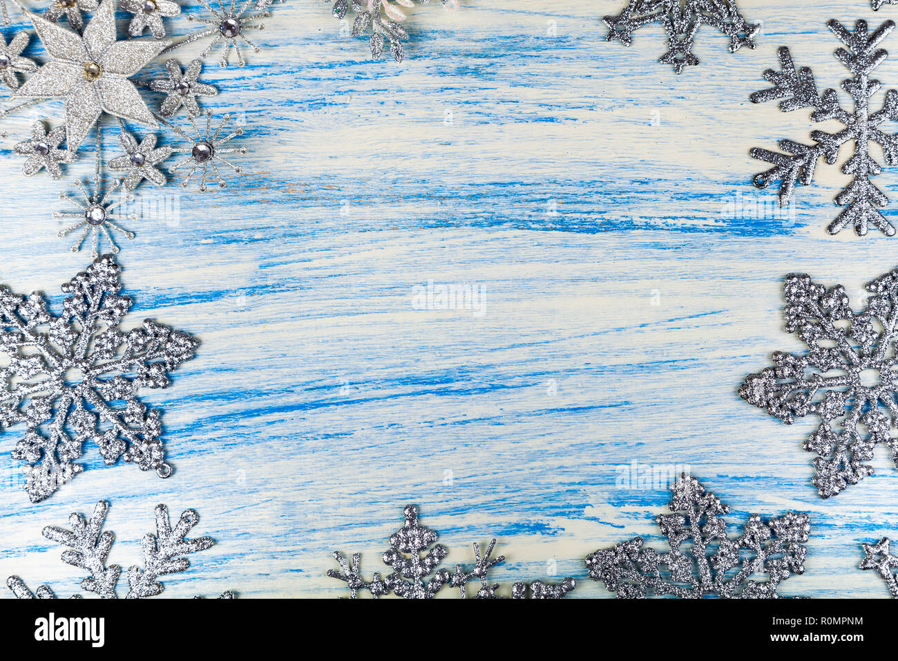 Weihnachten hintergrund mit schneeflocken und silber christbaumkugel und weihnachtssterne. Holz schieber mit weiß gewellt seidenband christbaumkugeln schneeflocken im rahmen angeordnet. Vektor nahtlose silber weihnachten hintergrund mit schneeflocken.