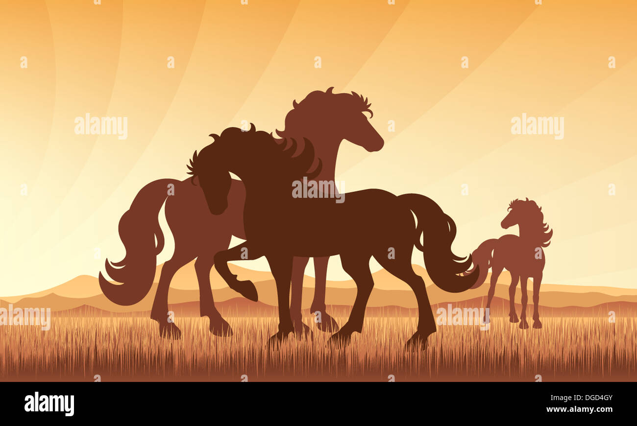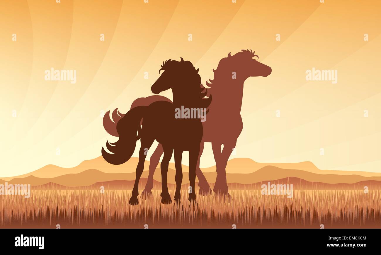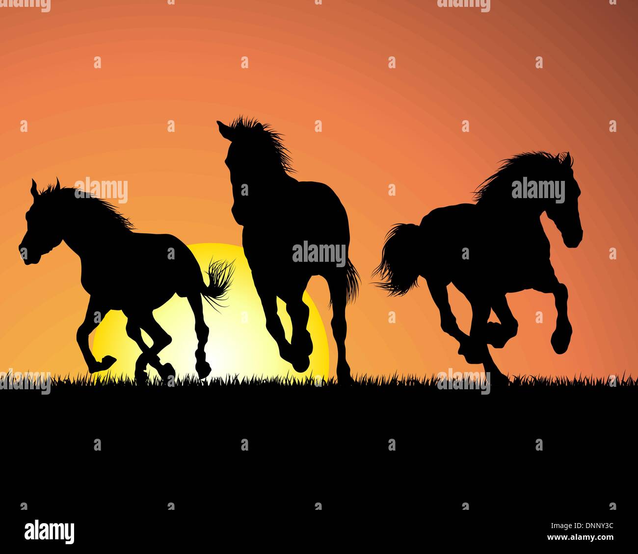 Pferde Im Feld Sonnenuntergang Hintergrund Vektor Silhouette