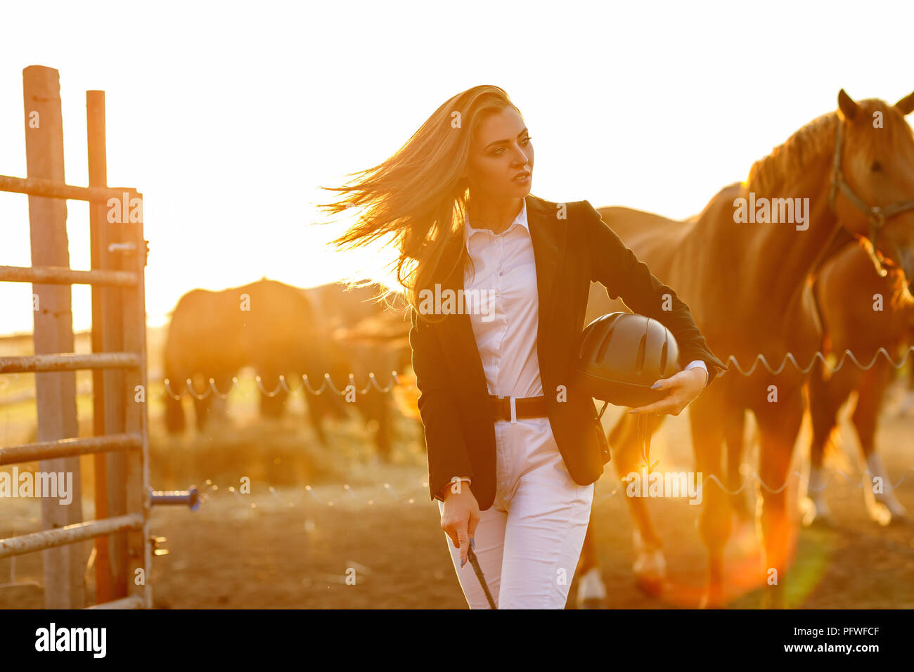 Portrait Von Eleganten Reiter Frau Mit Peitsche Steht Vor