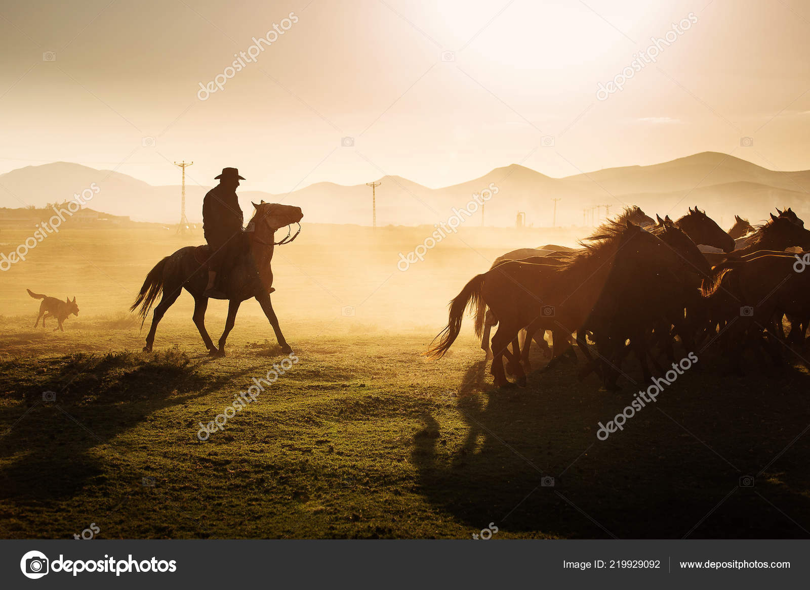 Wilde Pferde Führen Von Einem Cowboy Bei Sonnenuntergang Mit