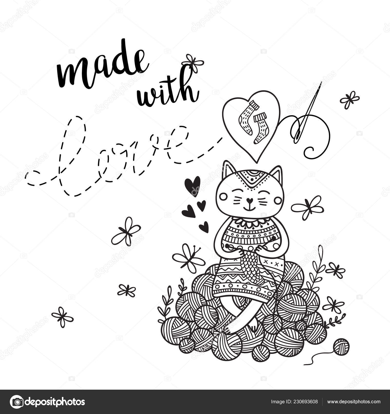 Kartenthema Stricken Vektor Mit Niedlichen Katze Und