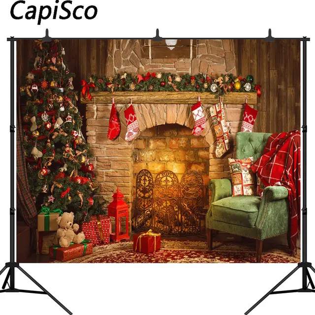Us 144 28 Offindoor Fireplace Merry Christmas Photo Background Printed Xmas Tree Toy Bear Gifts Chair Kids New Year Photography Backdrops In
