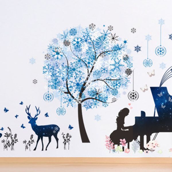 Großhandel Fashion Lady Playing Piano Unter Den Schneeflocken Wand Aufkleber Deer Gras Wand Papier Poster Wohnzimmer Schlafzimmer Hintergrund