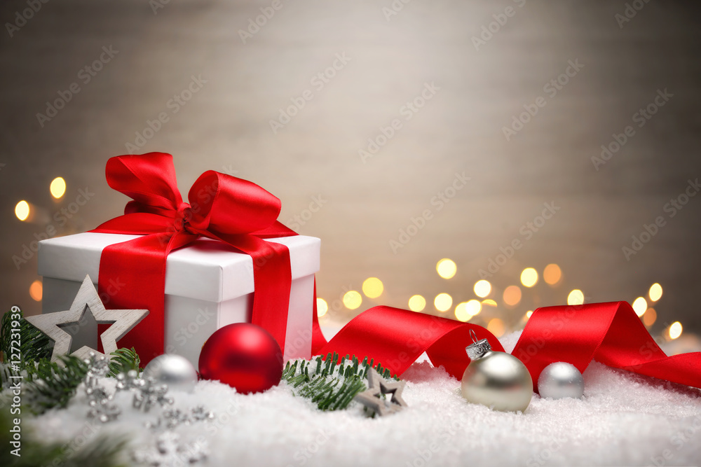 Lizenzfreies Foto 19574964 Weihnachten Hintergrund Mit Geschenk Und Rotem Band Kerzen