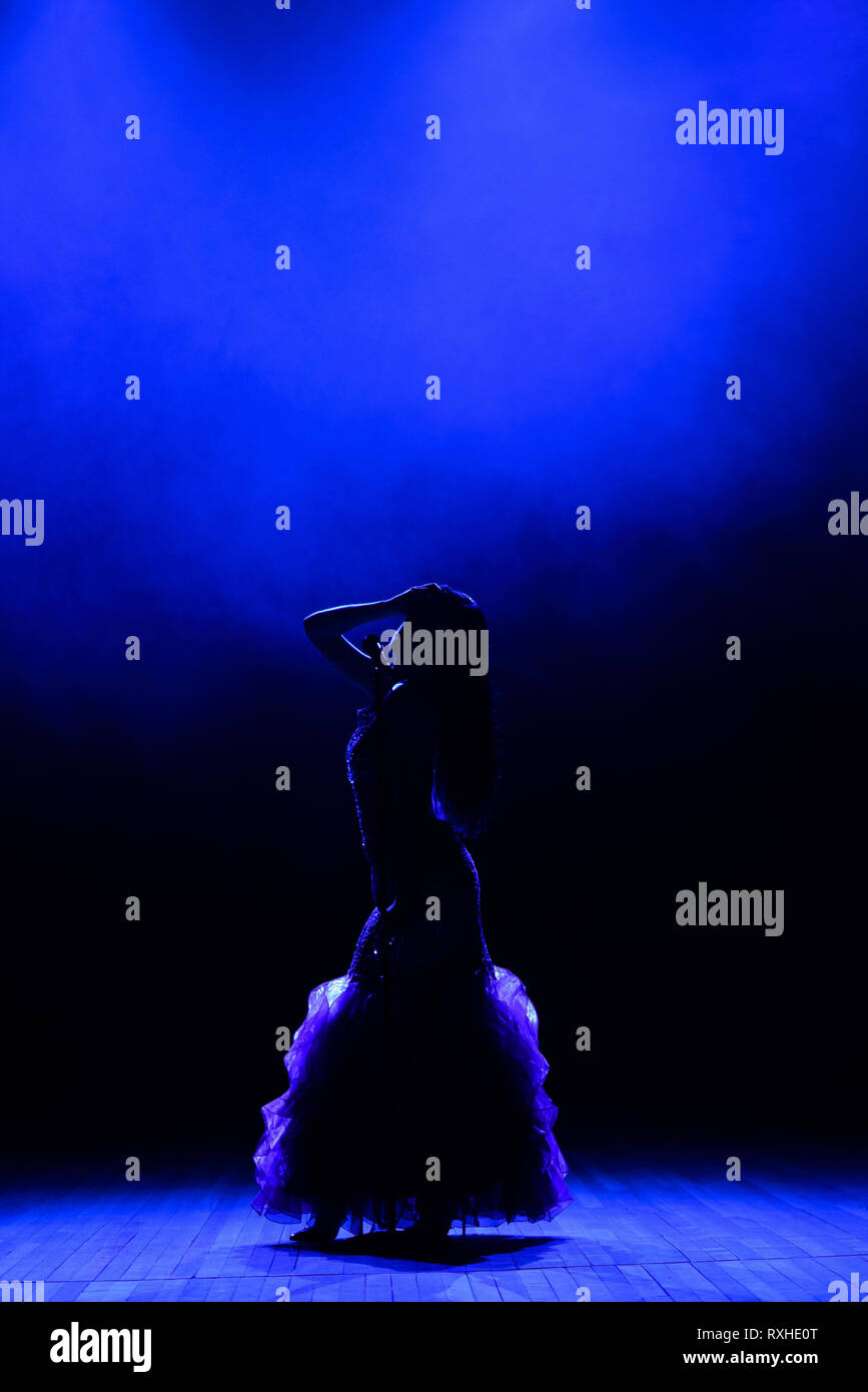 Silhouette Der Sängerin Auf Der Bühne Dunkler Hintergrund