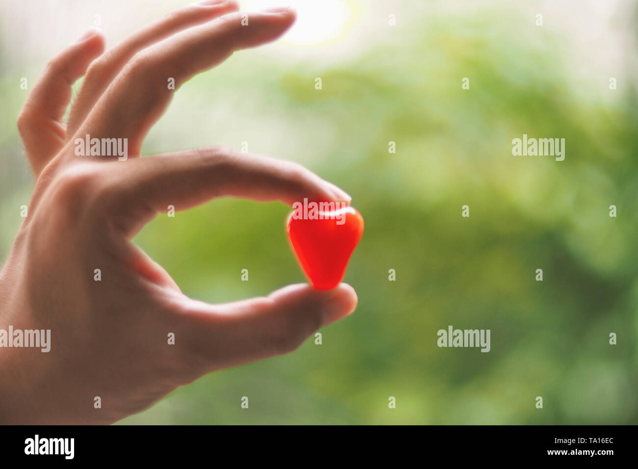 Menschliche Hand Pick Up Stück Rotes Herz Blur Grüne Natur
