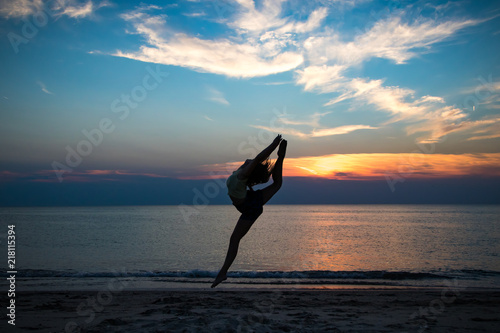 Junge Ballerina Vollzieht Einen Spagatsprung Am Strand Mit