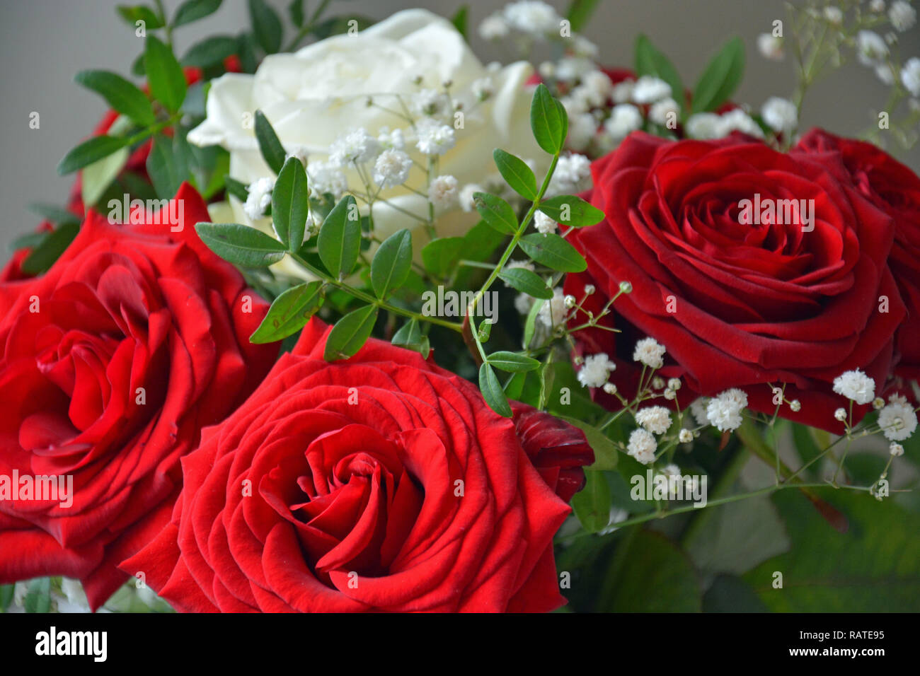 Strauß Rote Rosen Neben Geschenkbox Mit Silbernem Geschenk