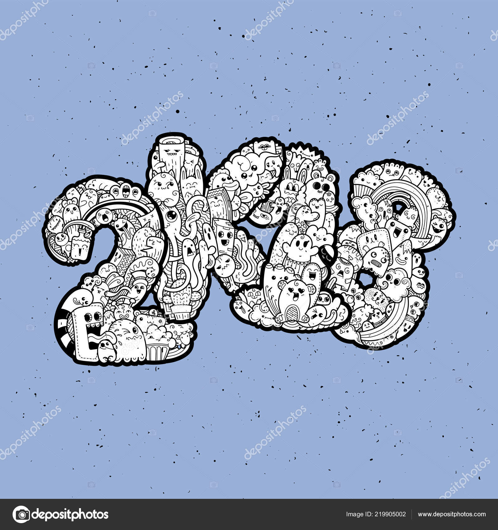 Silvester 2k 18 Monster Doodle Datum Reich Verzierte